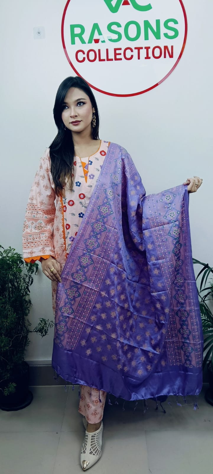 This elegant stitched three-piece set features a stunning boutique block print design, known for its intricate patterns and fine craftsmanship. The body of the dress is a beautiful pinkish-orange hue, offering a vibrant yet sophisticated look, while the dupatta is a soft lavender shade, adding a delicate contrast. Perfect for any special occasion, this outfit combines comfort, style, and traditional charm.