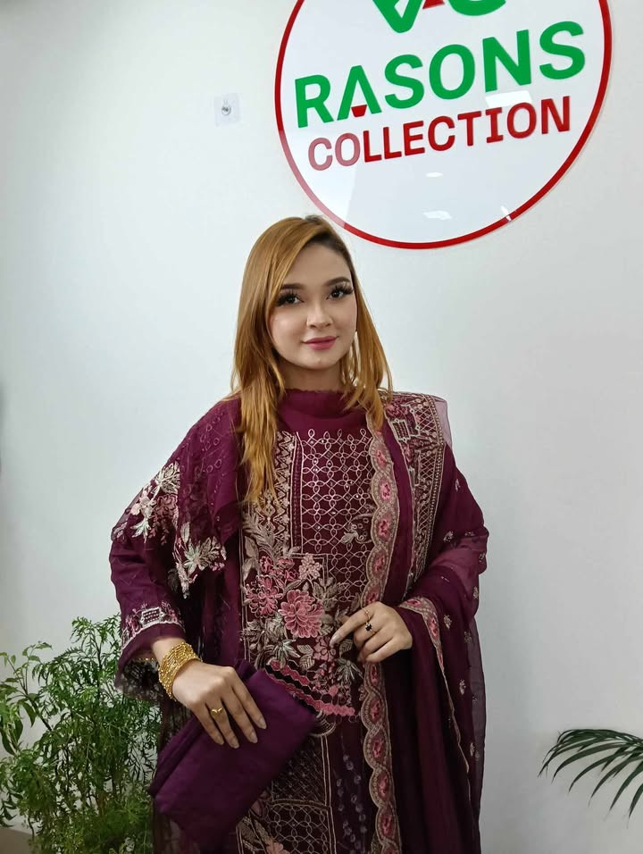 Introducing the exquisite Rujhan unstitched Pakistani dress, a timeless piece that exudes elegance and sophistication. Crafted from premium luxury chiffon georgette, this stunning ensemble in a rich magenta purple hue is perfect for formal occasions, weddings, or festive celebrations.